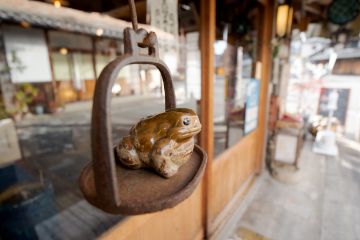 軒先や店内には、神の使い「二見蛙」の置物を飾っています。当時のお土産物店の名残でもあります。