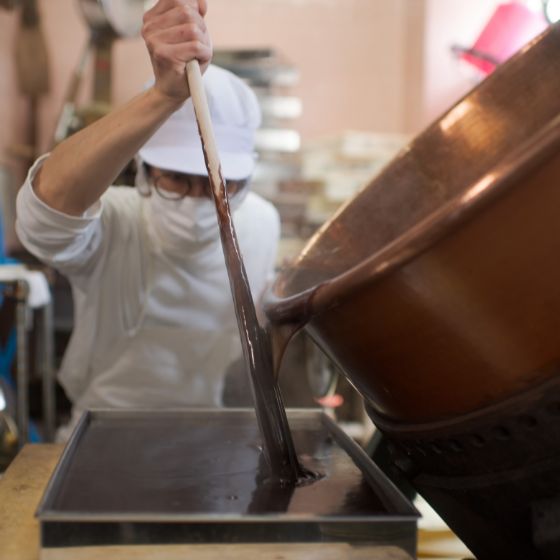 材料が全てきめ細かに溶けていることを確認しながら、「岩戸の塩ようかん」を型に流し込みます。羊羹の固さにばらつきがでないよう、目線は固定し、丁寧かつ迅速に両手を動かします。