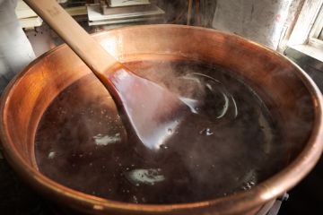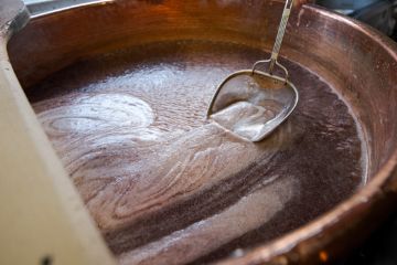 灰汁取りの様子。この徹底した灰汁取りが、「岩戸の塩ようかん」の美味しさの決め手となります。