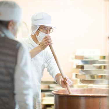 滑らかになった羊羹。職人の手で、羊羹の固さを確かめます。しゃもじの先の感触で、型に入れるタイミングを計ります。